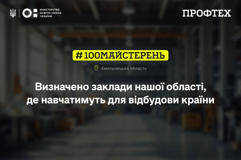 #100майстерень, що реалізується Міністерством освіти і науки України, триває оновлення навчально-практичної бази закладів професійно-технічної освіти. Два заклади Хмельниччини отримають фінансування на модернізацію майстерень. Загальна сума субвенції — 13 759 600 гривень