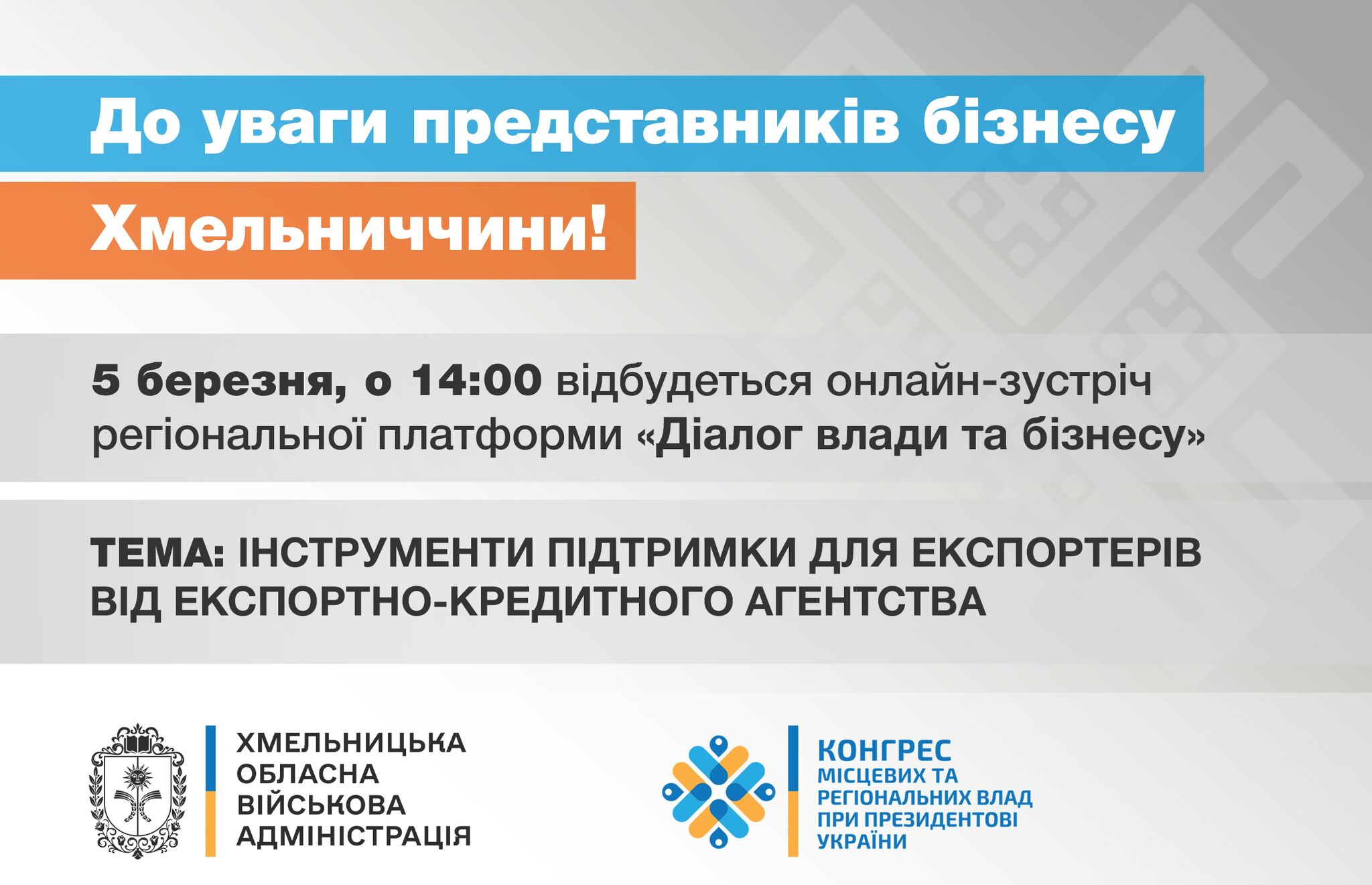 Запрошуємо Вас взяти участь у зустрічі в рамках регіональної платформи «Діалог влади та бізнесу», яка відбудеться у четвер, 05 березня, о 14:00 в онлайн-форматі на тему: “Інструменти підтримки для експортерів від Експортно-кредитного агентства” за участю фахівців ПрАТ “Експортно-кредитне агентство”.