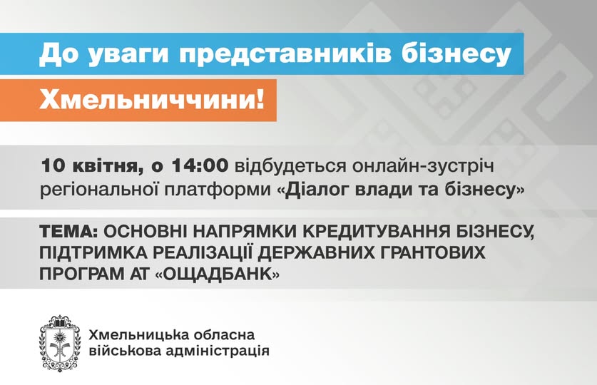 Запрошуємо взяти участь у зустрічі в рамках регіональної платформи «Діалог влади та бізнесу», яка відбудеться у четвер, 10 квітня, о 14:00 в онлайн-форматі.