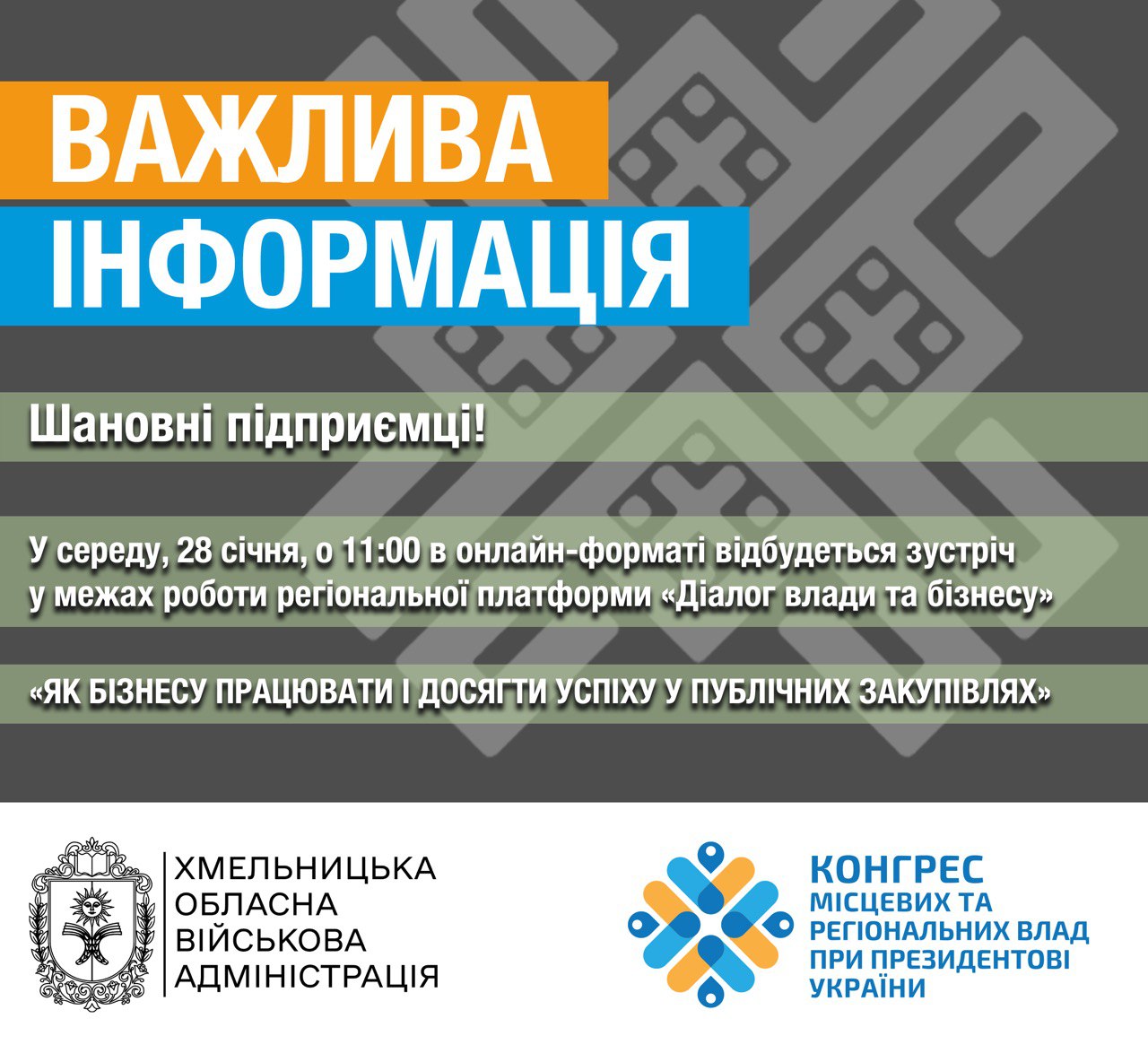 Запрошуємо Вас взяти участь у безкоштовному практичному навчанні на тему: «Як бізнесу працювати і досягти успіху у публічних закупівлях», яке відбудеться 28 січня поточного року.