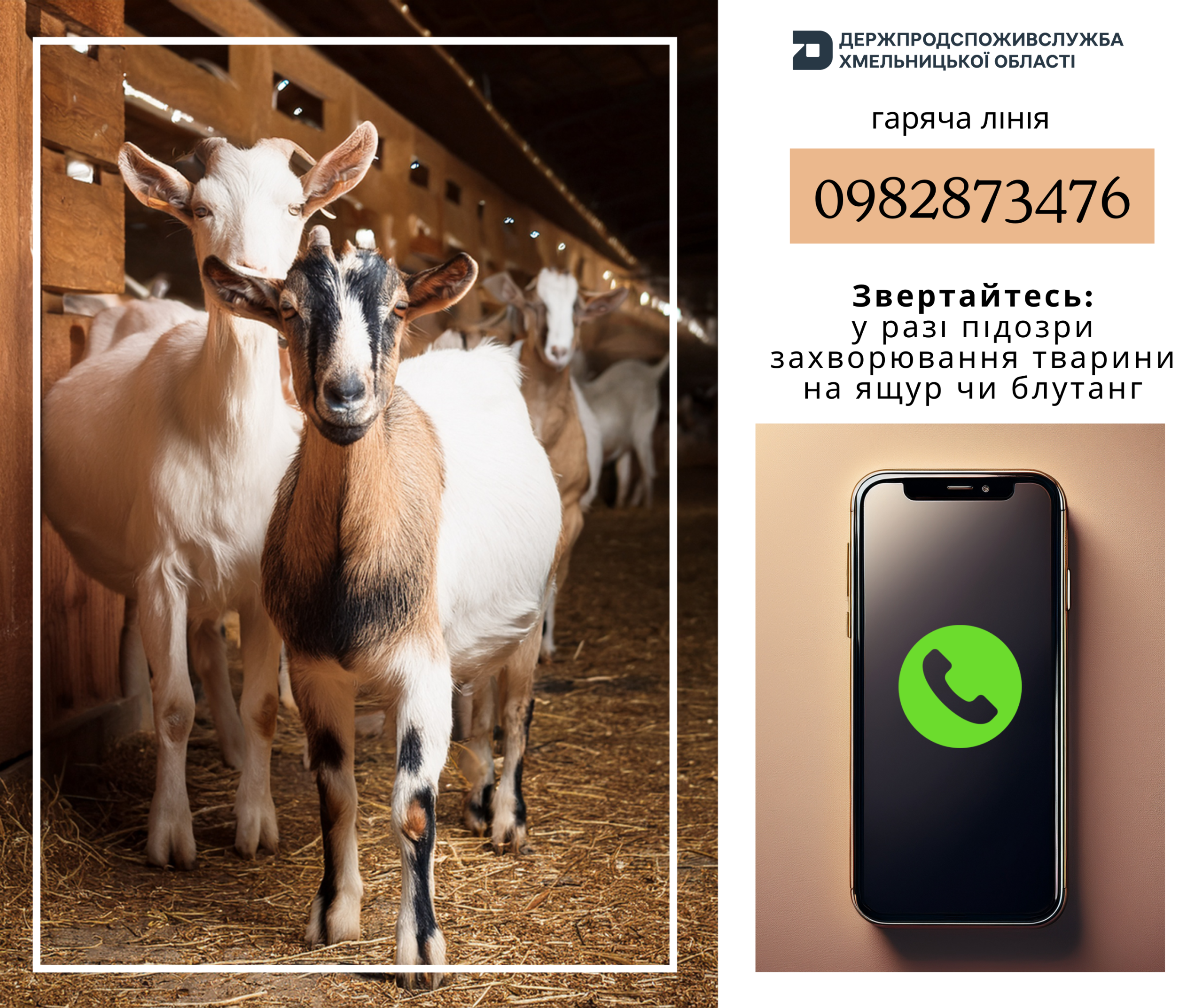 З метою оперативного реагування та запобігання поширенню на території Хмельниччини інфекційних хвороб тварин Держпродспоживслужбою Хмельницької області створено «гарячу лінію» для повідомлень про випадки підозри захворювання тварин на ящур чи/та блутанг: 098 287 34 76.