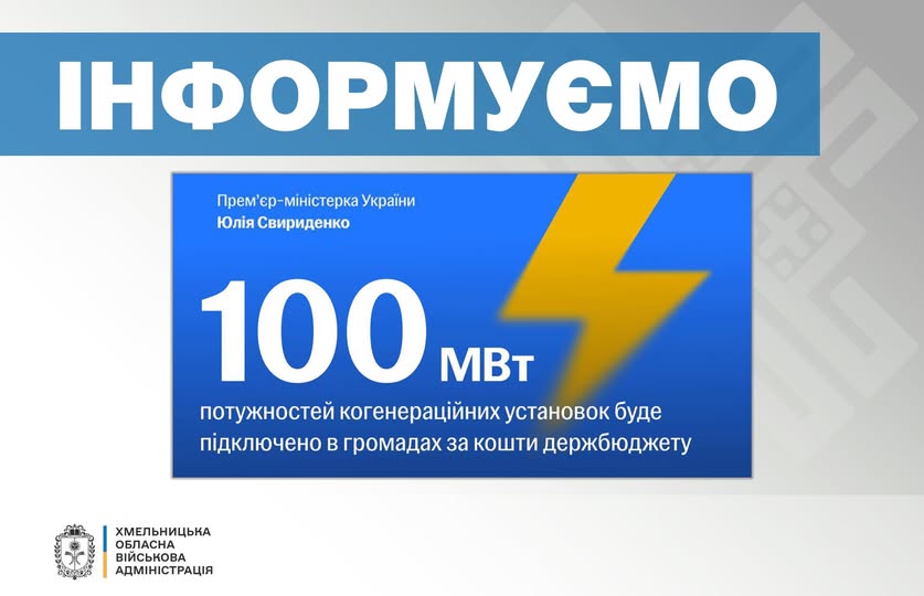 Хмельницька область підключить до мережі 19 когенераційних установок загальною електричною потужністю 19,3 МВт та тепловою — 28 МВт у межах підготовки до наступного опалювального сезону. На це уряд виділив 12,5 млн грн для Хмельниччини.