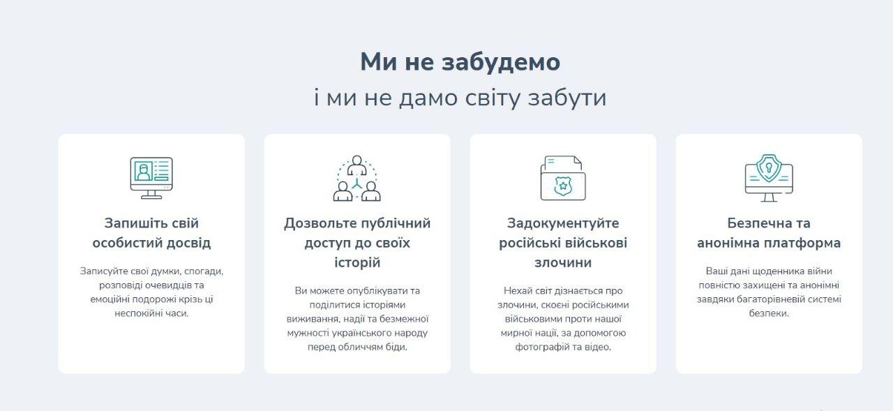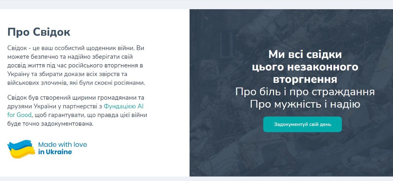 Svidok.org. Це – персональний воєнний щоденник, де кожен українець анонімно може поділитись своїм воєнним досвідом. Думки, світлини з рідних міст, спогади, переживання.