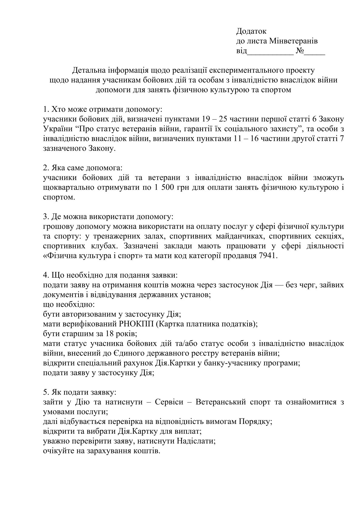 Повідомляємо про реалізацію експериментального проекту щодо надання учасникам бойових дій та особам з інвалідністю внаслідок війни допомоги для занять фізичною культурою та спортом, затвердженого постановою Кабінету Міністрів України від 03.01.2025 №2