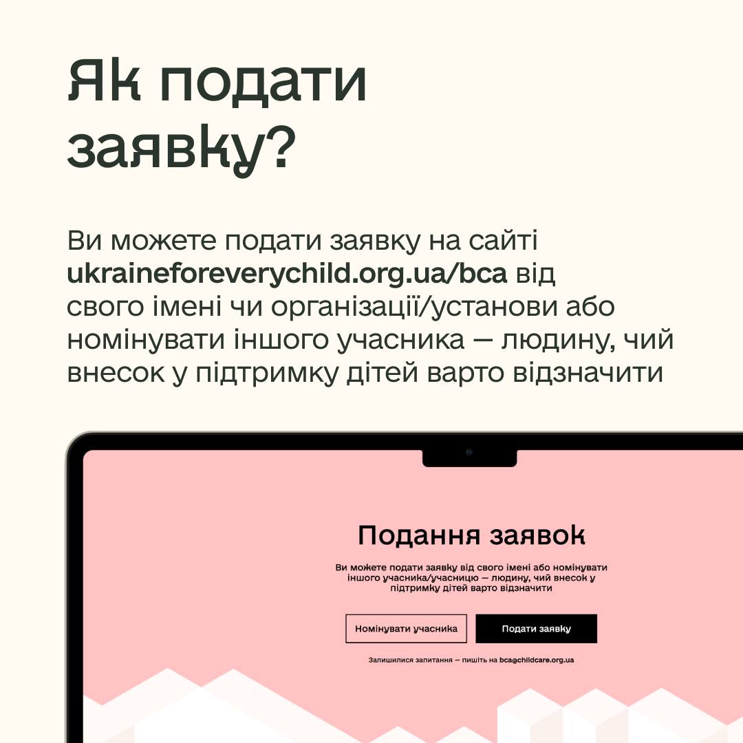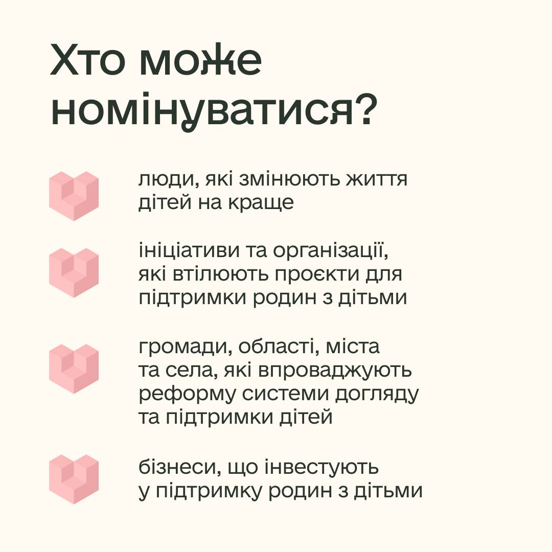 «Родина для кожної дитини. Better Care Awards» – це відзнака для людей, які створюють найкращі умови для кожної дитини. Номінуватися можуть люди, ініціативи, громади, області та бізнеси, подавши заявку на сайті ukraineforeverychild.org.ua/bca .