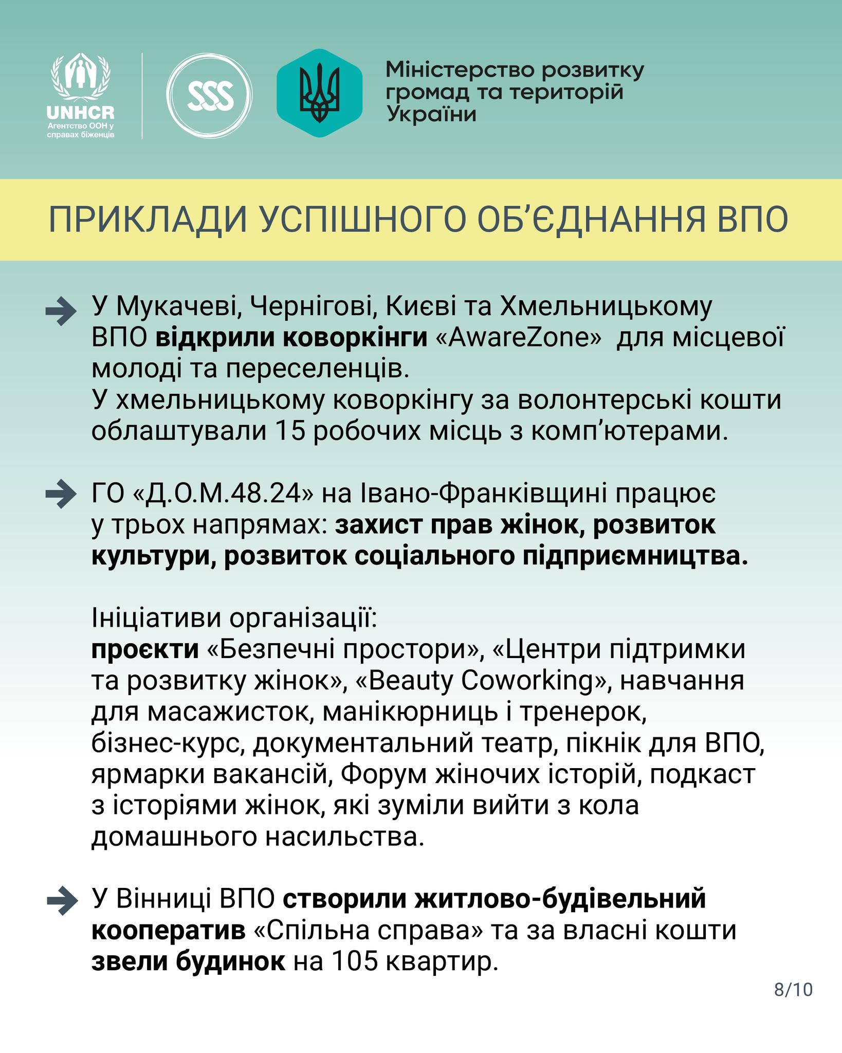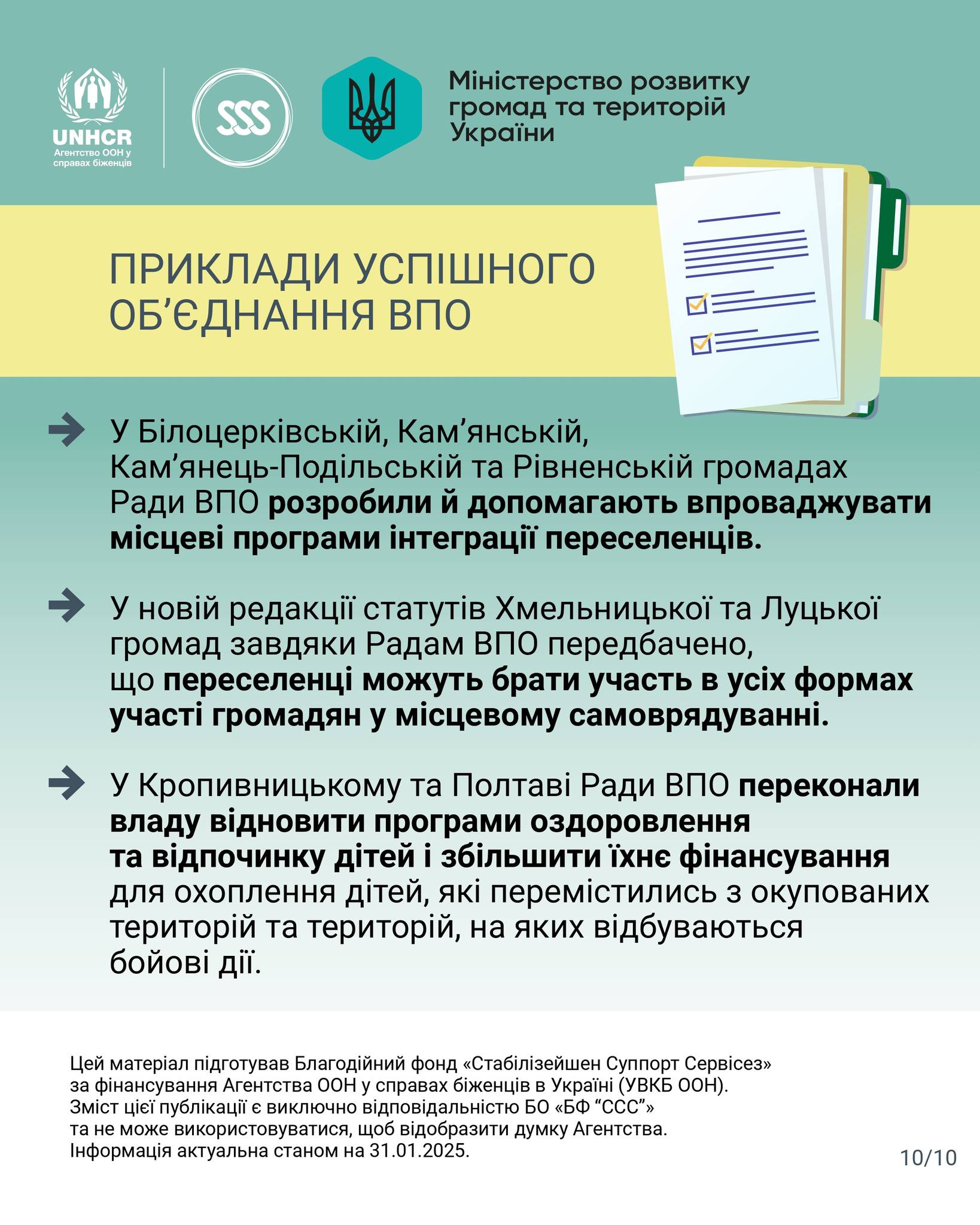 Об’єднання ВПО можуть допомогти досягти цілей, які відповідають їхнім спільним інтересам, забезпечити соціальну справедливість, захист і реалізацію всіх прав ВПО