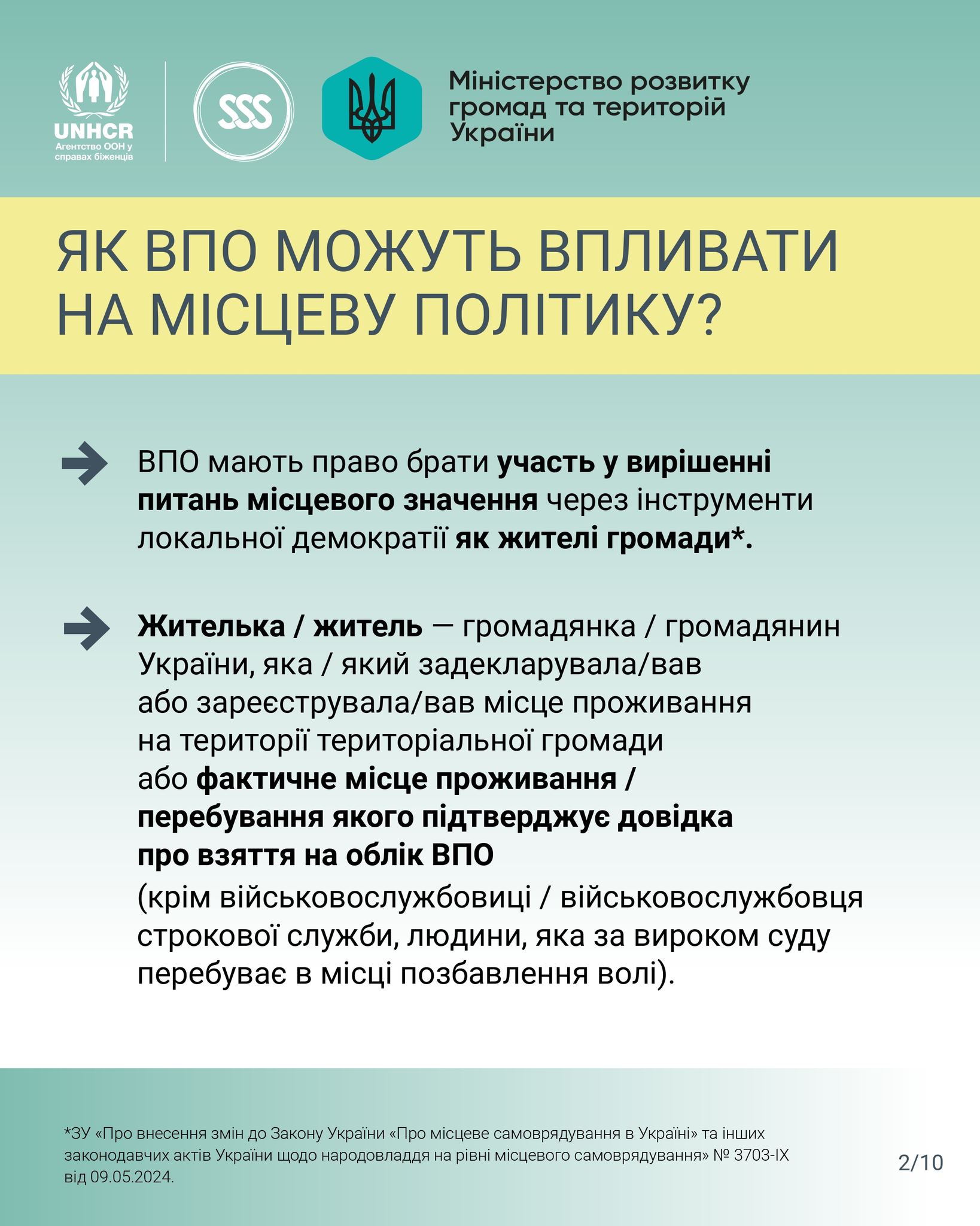 Внутрішньо переміщені особи (ВПО), які проживають у різних громадах України, мають право брати участь у вирішенні питань місцевого значення нарівні з іншими мешканцями. Це передбачено чинним законодавством.