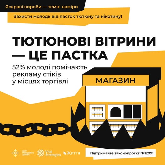 З 2023 року в Україні заборонено рекламувати електронні пристрої для нагрівання тютюну. Проте тютюнова індустрія використовує вітрини у місцях торгівлі для агресивного залучення нових курців серед молоді. Щороку тютюнові компанії витрачають на це до 1,6 мдрд грн*.