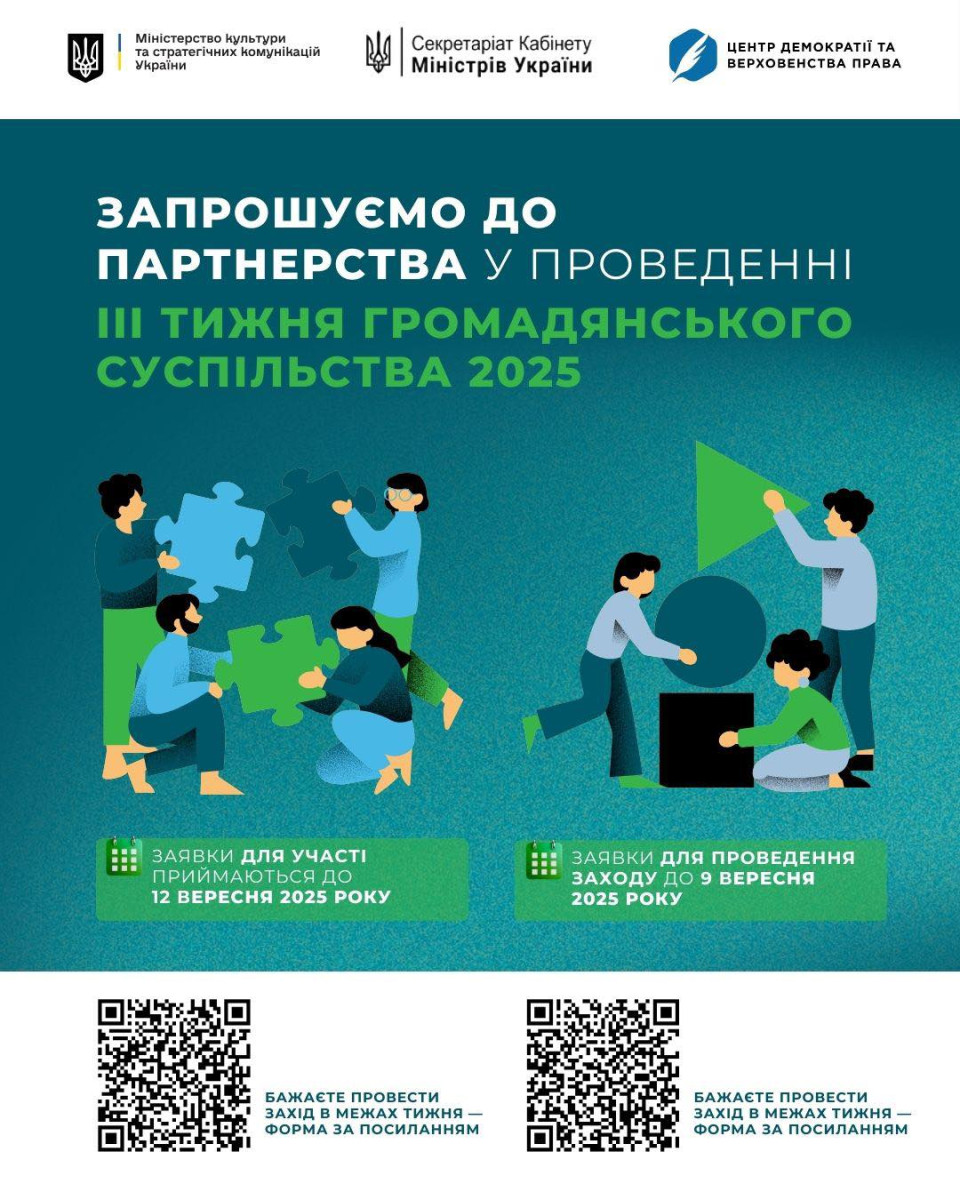 З 15 до 21 вересня в Україні відбудеться ІІІ Тиждень громадянського суспільства — подія, спрямована на підтримку активної громадянської позиції та розвиток ініціатив, що формують відкрите й справедливе суспільство.