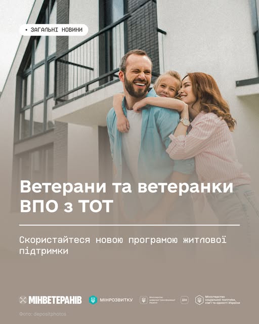 Ветерани та ветеранки ВПО з ТОТ — скористайтеся новою програмою житлової підтримки.