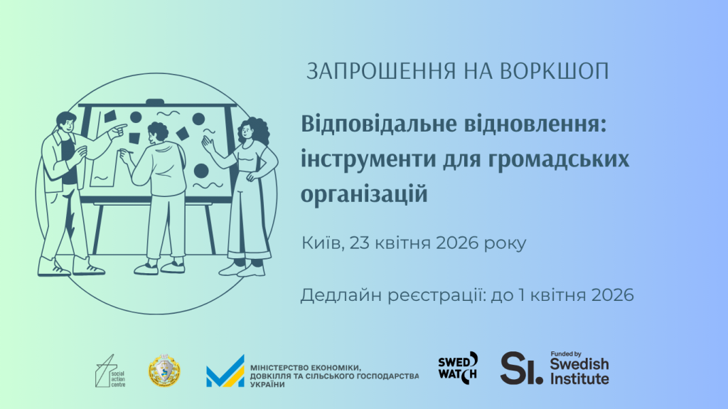 У межах проєкту «Відповідальне ведення бізнесу та стала відбудова в Україні: роль шведських акторів», який реалізується за фінансової підтримки Шведського інституту та партнерами якого є Мінекономіки, ГО «Центр “Соціальна Дія”», Національний юридичний університет імені Ярослава Мудрого та Шведська Громадська організація Swedwatch, оголошено набір на участь в одноденному воркшопі.