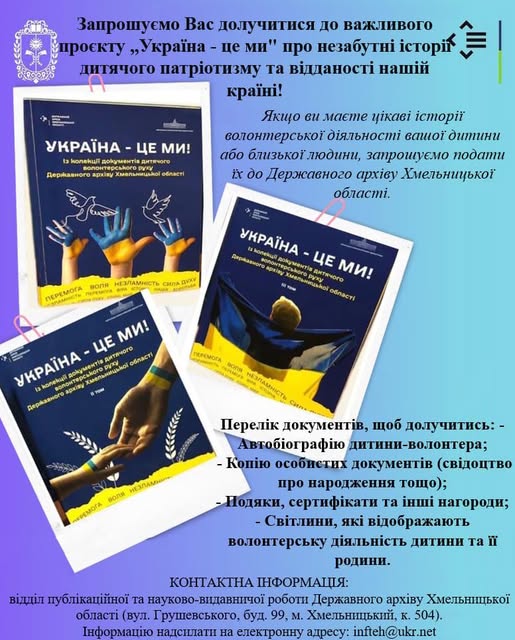 Запрошуємо долучитися до важливого проєкту, який започаткувала Хмельницька обласна військова адміністрація “Україна – це ми!” про незабутні історії дитячого патріотизму та відданості нашій країні.