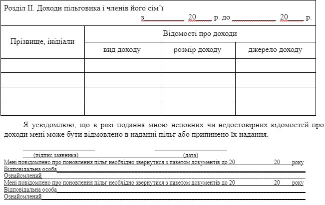Заповнюється особою або законним представником особи, яка має право на пільги з оплати послуг за користування житлом, комунальних послуг, паливом, скрапленим газом, телефоном, послуг з установлення квартирних телефонів та інші види пільг відповідно до законодавства.